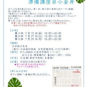 ◆終了しました◆ 第3~5回 〈暮らしの中の看取り〉準備講座@小金井 開催のお知らせです。 今度は少人数でじっくりと語り合えるよう、3回に分けてご案内…